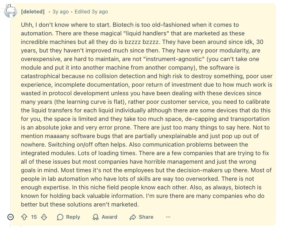 I mention my lack of background context entirely because it has had some unfortunate consequences on my ability to understand the broader field of lab automation. Specifically, that it is incredibly easy for me to get taken for a ride.