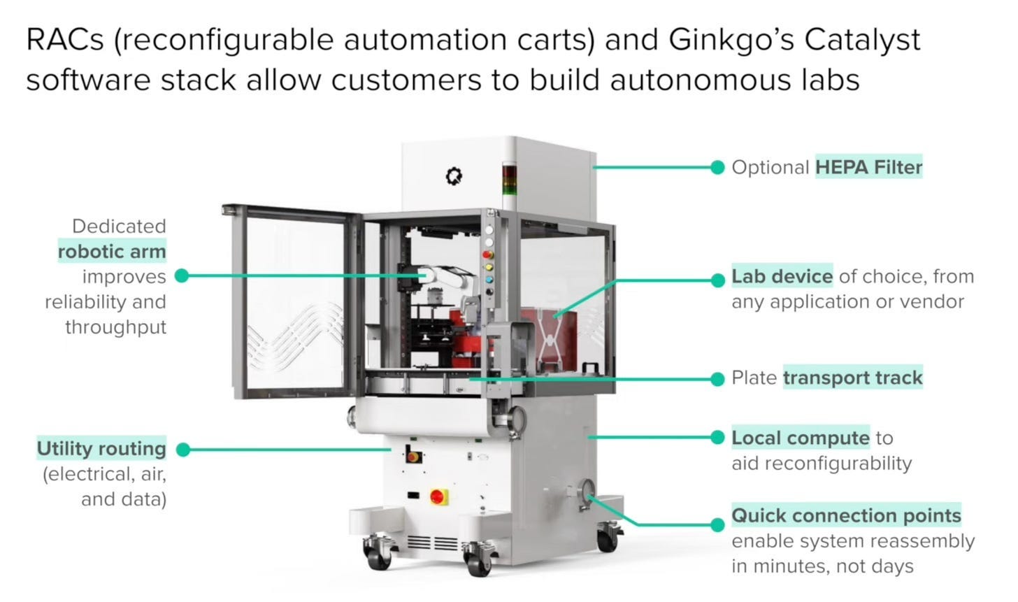 And of course, Ginkgo. Yes, Ginkgo is a mild memetic allergen to those familiar with its prior history, but I do encourage you to watch their 2026 JPM presentation over their recent push into automation. It’s quite good! The purpose of the presentation is to push Ginkgo’s lab automation solution—Reconfigurable Automation Carts, or RAC’s—but serves as a decent view into the pain points of building better lab automation. What are RAC’s anyway? Basically a big, modular, standardized cart that can have boxes (+other things) inserted in, and has an arm directly installed: