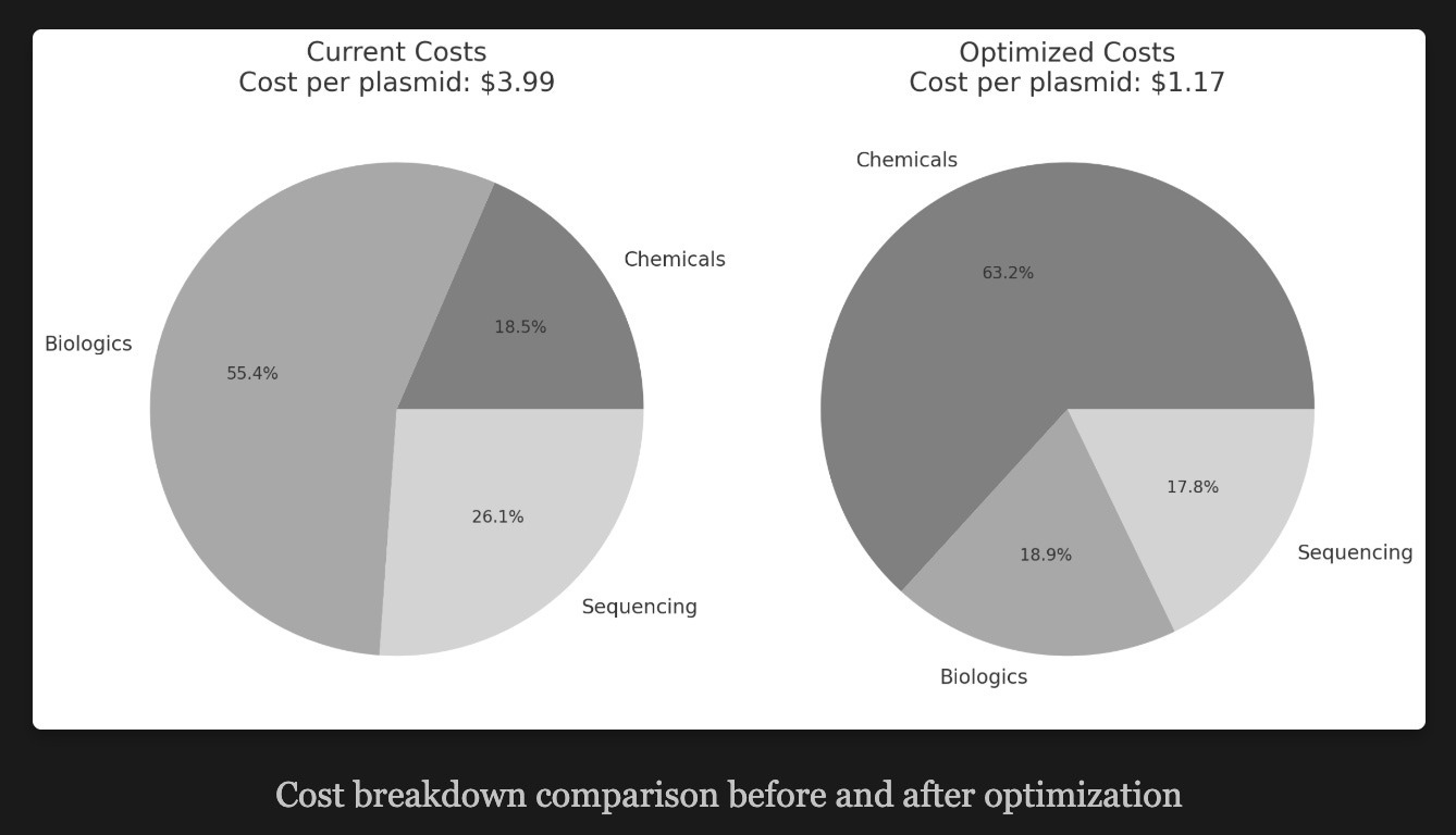 As an example, the Synbio25 essay offered this picture showing the plasmid production cost differences between unoptimized and optimized settings (read: producing enzymes + cells in-house and using maximum-sized sequencing flow cells). Over twice as cheap!