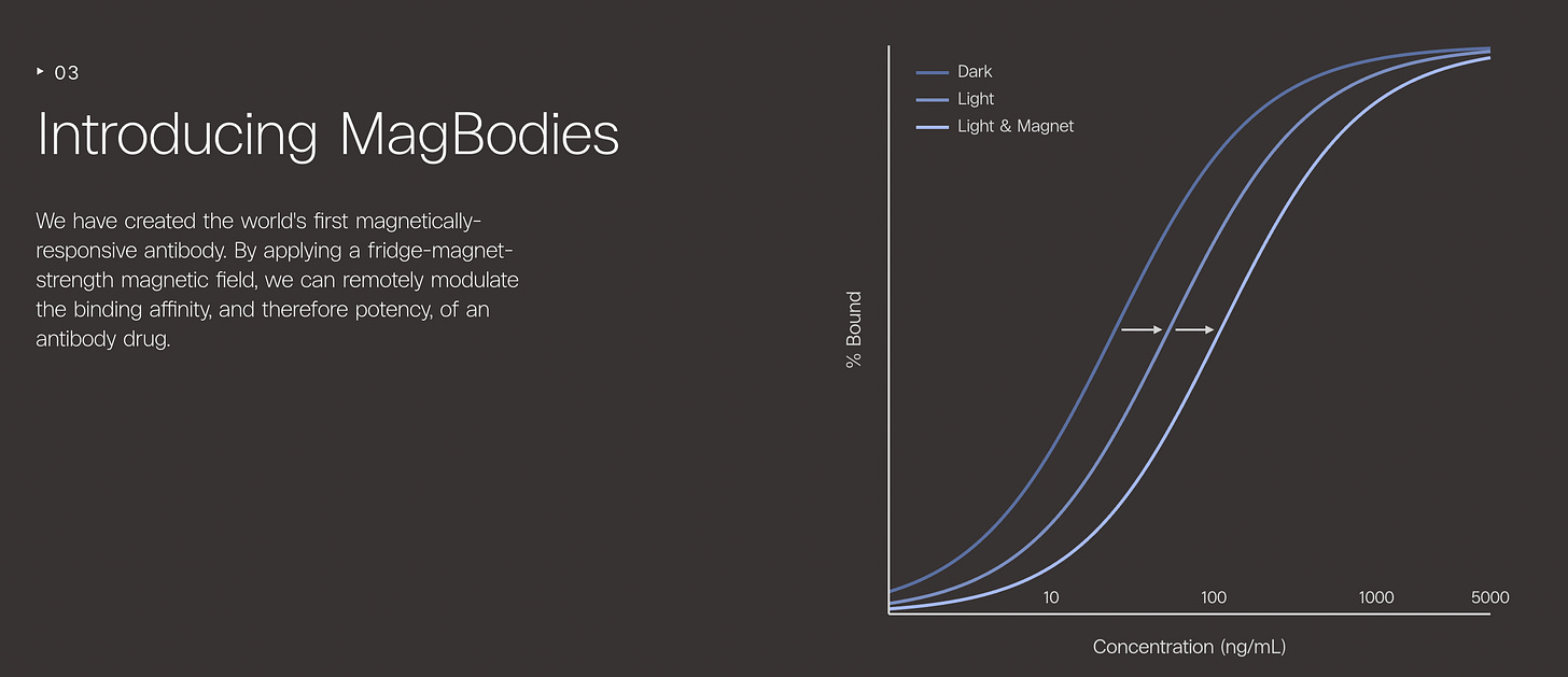 As of 2026, there is now a company formed around this idea: Nonfiction Labs—co-founded by Richard Fuisz, who gave a really great Core Memory podcast over his work there—which has developed the first ever magnetically sensitive antibody, or ‘MagBody’.