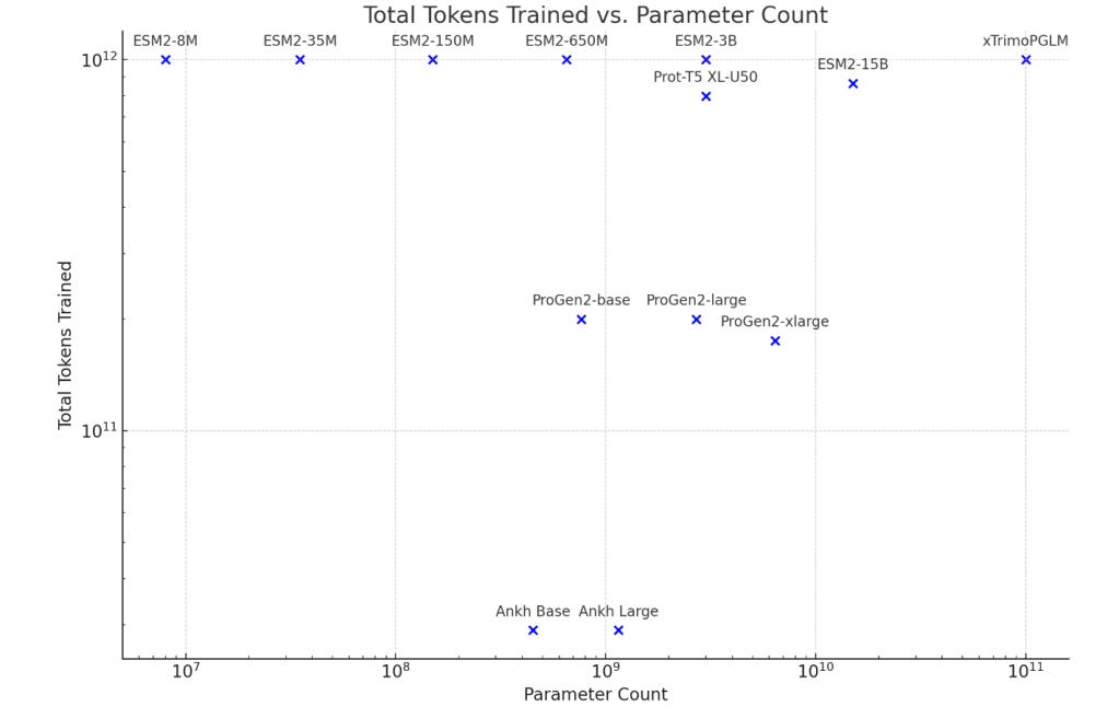 It could be the case that xTrimoPGLM is massively undertrained, the paper gave no proof that the training they have currently done fully exploits the underlying dataset or parameter count-size.